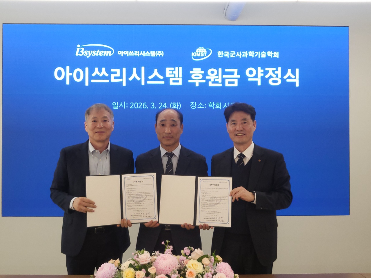 아이쓰리시스템(주)(대표이사 정한)과 한국군사과학기술학회는 2026년 3월 24일 학회사무국에서 후원금 약정식을 개최하였습니다.